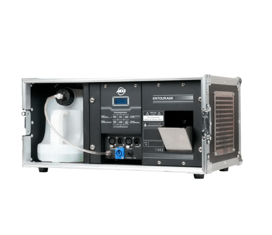 The ADJ Entourage is a professional grade touring Faze Machine built into a durable flight case. This pro Fazer offers a very quick warm-up time and produces a massive amount of atmosphere. The Entourage features an easy to read LED function display with fog timer, continuous fog and manual fog options. Connections include 3-pin and 5-pin DMX and Locking Power AC input. Uses high quality water based fog fluid.