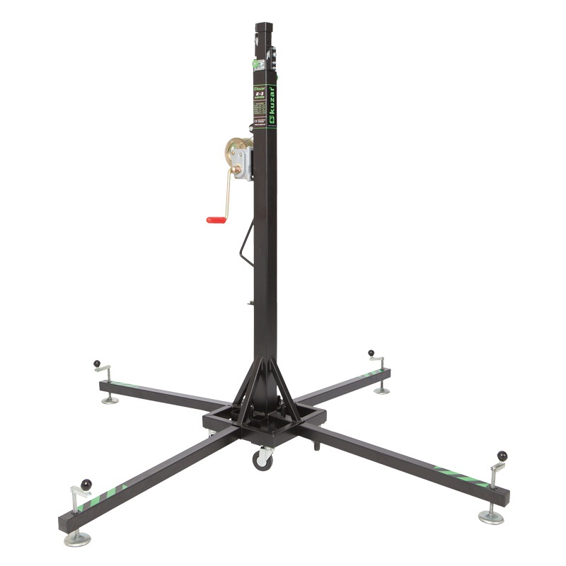 Designed for the professional user in the event and rental industry, the lifters feature automatic locks for increased safety. Manufactured in Europe to both BGV C1 and CE (2006/42/CE) standards, compact tower lift, reaching some 5.35m with a load capacity of up to 125kg. A large steel base, together with four heavy duty steel outriggers provide increased stability, while swivel castors make transportation easy. Each of the four legs have adjustable anti-slip rubber stabilizing plates.